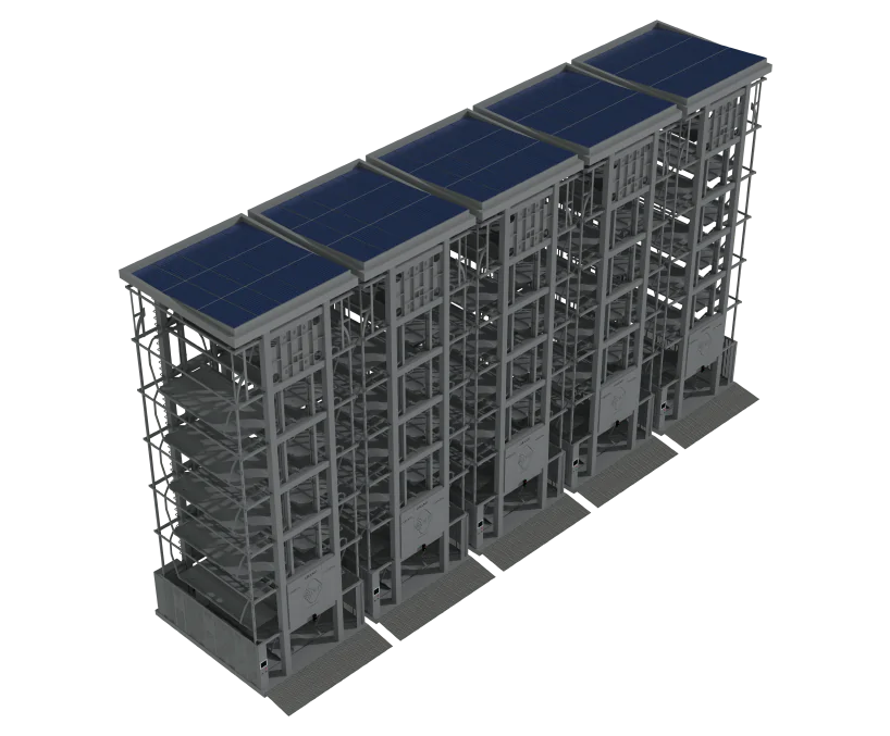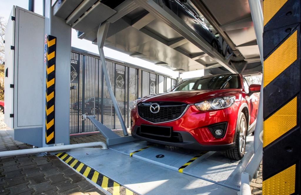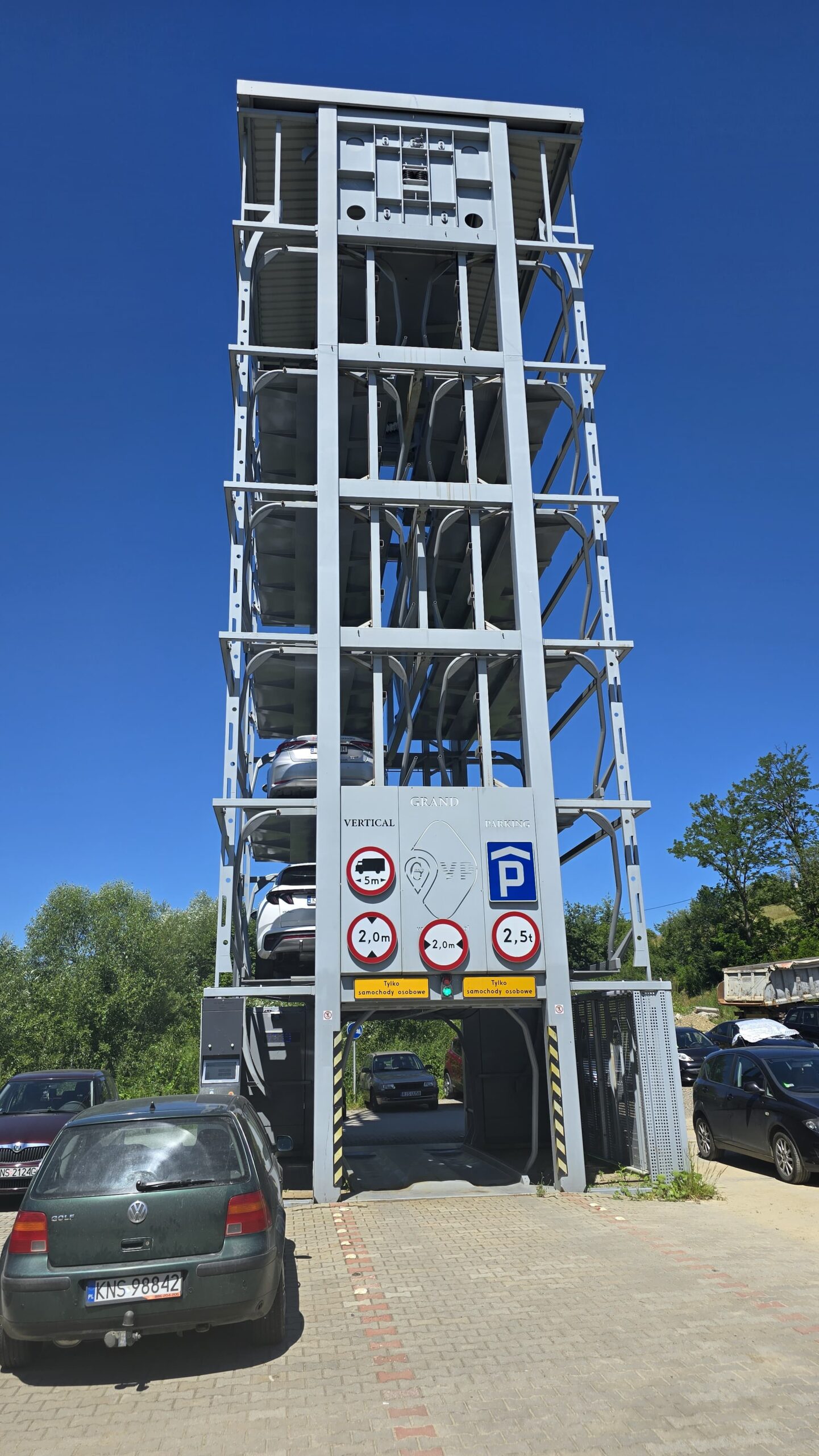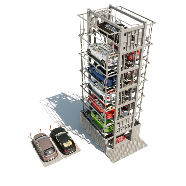 VERTICAL PARKING ist eine Maschine für das automatische, vertikale Parken von Fahrzeugen im Selbstbedienungssystem, die das Abstellen von 6 bis 16 Autos auf rotierenden Parkplattformen ermöglicht.